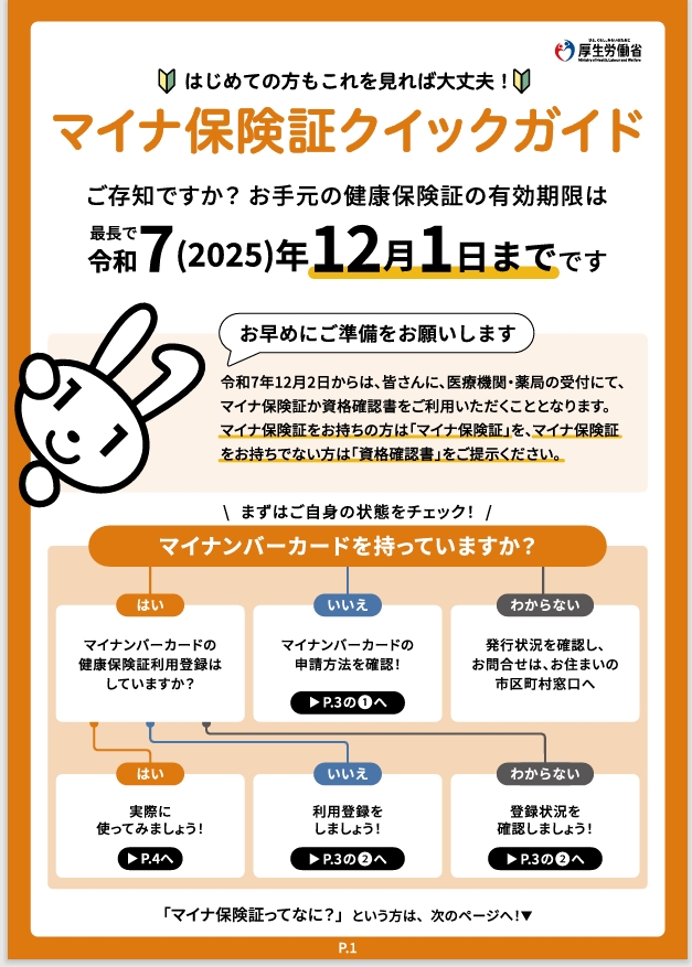 2025年12月2日からは、「マイナ保険証」か、「資格確認書」をご利用いただくことになっています。マイナンバーカードを持っているが、保険証として利用するための紐付けをされていない方は、当院のカードリーダーに通してもらうと、マイナ保険証として利用できるように紐付けすることができます。また、マイナ保険証をお持ちでない方は、資格確認書が届いていると思いますので、そちらをご提示ください。詳しくは、厚生労働省のホームページに詳しく載っているので、ご確認ください。